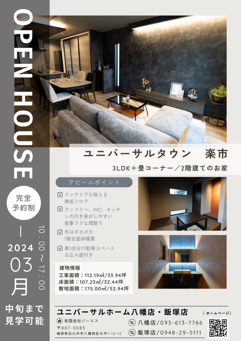 2023年12月18日(月) イベント・見学会 < お知らせ モデルハウスOPEN! ユニバーサルホーム飯塚店エリアに「街かどモデルハウス」OPEN☆ お客様のご新築を2024年3月まで、モデルハウスとしてお借りいたしました! とてもお洒落な内装に、こだわりの詰まった間取りを ぜひ見にいらしてみませんか? 飯塚店、八幡店からもご案内しております☆ お気軽にお問い合わせ下さい! (完全予約制となっております。予約の際に、楽市モデル見学希望とコメント下さい。)