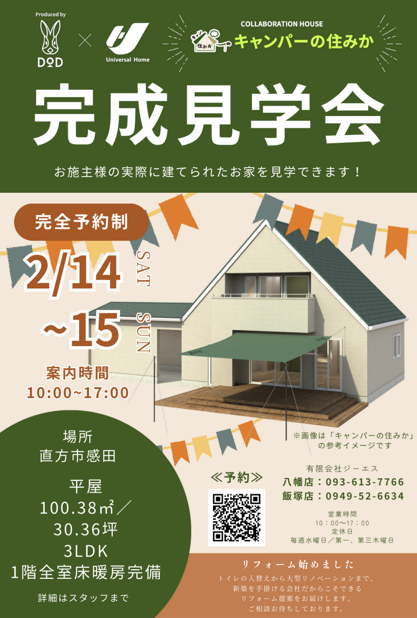2026年02月01日(日) イベント・見学会 < お知らせ NEW 【DOD×ユニバーサルホームコラボのお家】完成見学会 キャンパーのすみか キャンプブランドDODとユニバーサルホームがコラボした『キャンパーのすみか』のお家。 アウトドアが趣味な方はもちろん、快適性やデザインにもこだわられたお施主様の完成したお家を見学できるチャンスです! 建築や建替えに興味のある方はぜひお気軽にお問い合わせください。 内容 【日時】 2026年2月14日(土)~2月15日(日) 10:00~17:00 【場所】 福岡県直方市感田 ※場所や仕様等の詳細はご予約の際改めてご案内致します。 ※見学会は完全予約制です