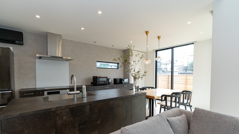 グラフテクトのキッチンと一枚板のダイニングテーブルが並ぶこの空間は
