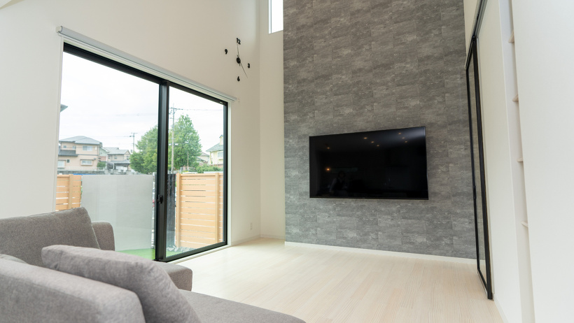 ダイニングに続くリビングはハイサッシ(窓)と、平屋ならではの勾配天井で、