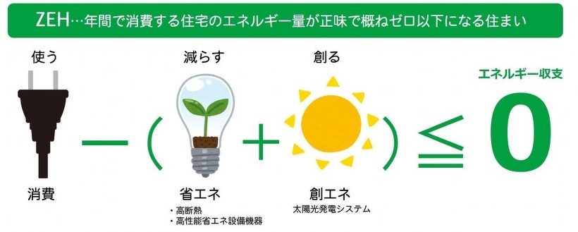 簡単にご説明しますと、使う電気-(省エネ機器+省エネ断熱+太陽光などで造るエネルギー)=消費エネルギー0の住宅