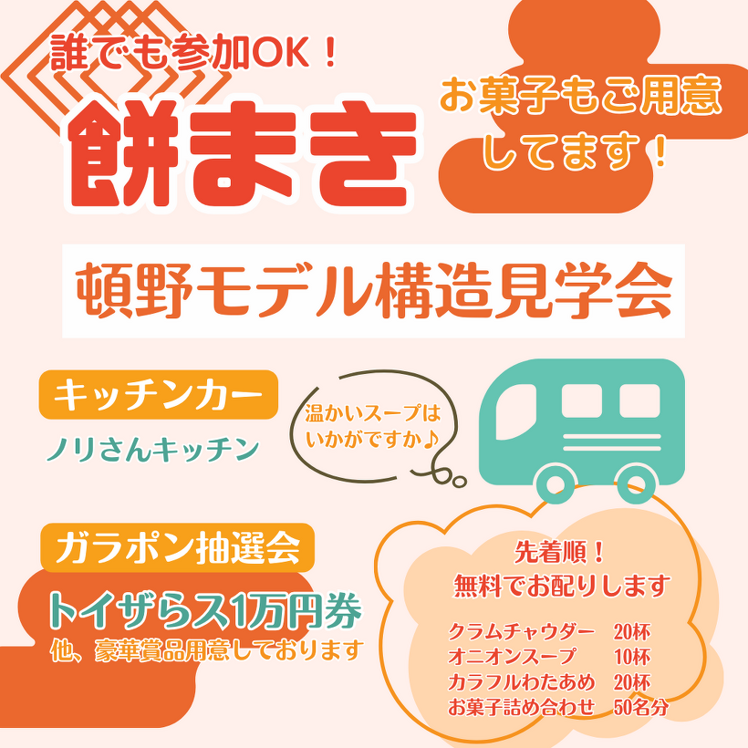 当日はガラポン抽選会やお子様用にお菓子のプレゼント、キッチンカーの出店もございますので(数に限りがございます)、建築にご興味のある方、イベントを楽しみたい方はぜひお気軽にご参加ください。