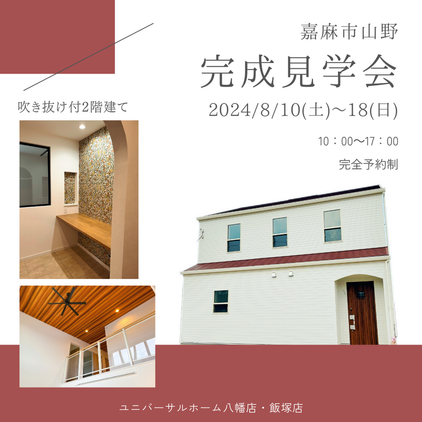 2024年08月10日(土) スタッフブログ < お知らせ 【8/10(土)~8/18(日)】完成見学会のご案内 嘉麻市山野にて完成見学会のご案内です! ◆吹き抜け付二階建てのお家 ◆ナチュラルベースの空間に壁紙や建具のアクセントが特徴 間取りを参考にしたり床材等を体感したりすることができますので、お家造りが気になる方はぜひお気軽にお問い合わせください。 ≪見学会情報≫ 日時:2024/08/10(土)~08/18(日) 時間帯:10:00~17:00 アクセス:嘉麻市山野 完全予約制