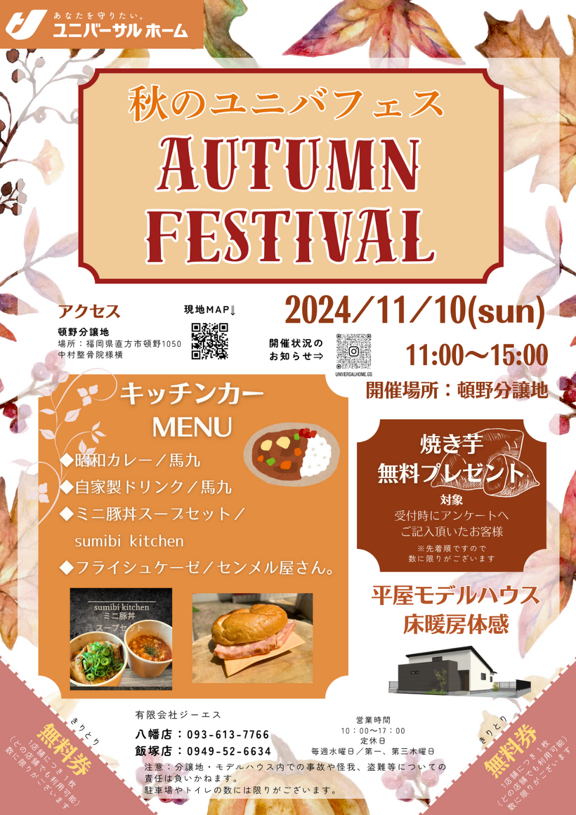 2024年10月28日(月) スタッフブログ < お知らせ イベント開催 こんにちは!! 今回は11月イベントについてです!! 11/10(日) 【秋のユニバフェス】開催します!! 近頃、気温も低くなってきましたので 床暖房も稼働します!! 是非!体感しに来てください!! 参加するだけでも【焼き芋】プレゼントしますので ご来場お待ちしております! 各サイト 八幡店 飯塚店 ユニバーサルホームのHPはこちら