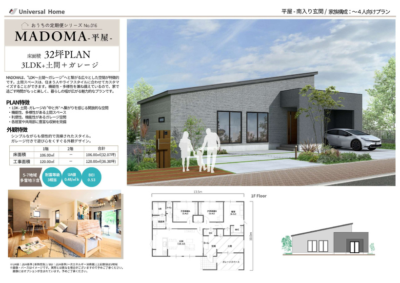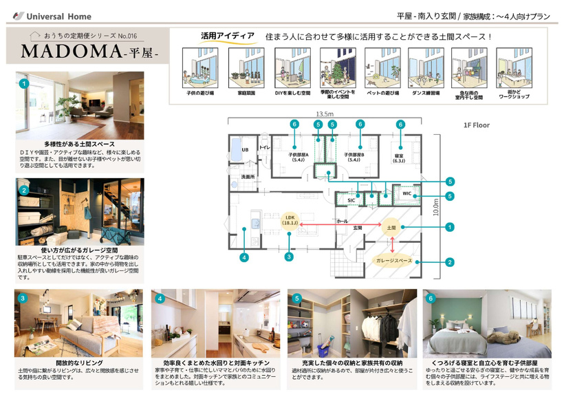 MADOMAは、“LDK~土間~ガレージ”へと繋がる広々とした空間が特徴的です。土間スペースは、住まう人やライフスタイルに合わせてカスタマイズすることができます。機能性・多様性を兼ね備えているので、家で過ごす時間がもっと楽しく、暮らしの幅が広がる魅力的なプランです
