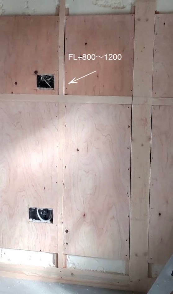 コンセント付近には壁掛け用の金具を支えるために下地材を補強で入れています