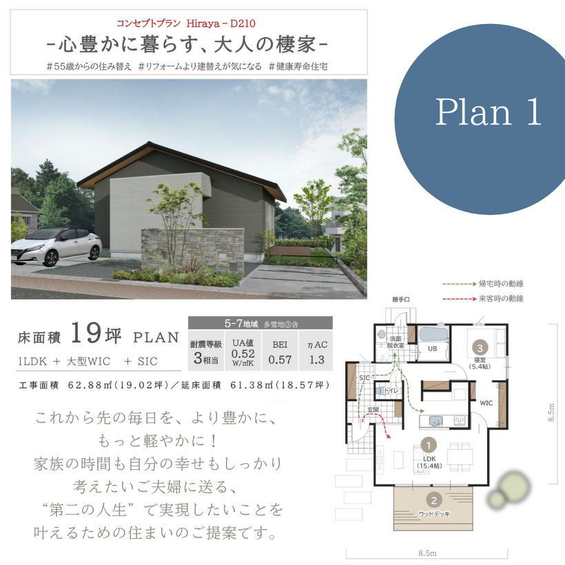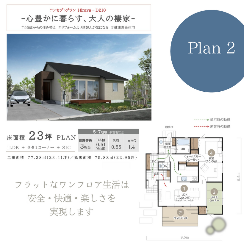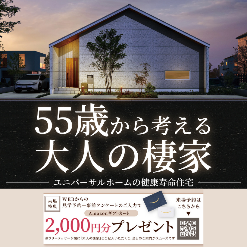 2025年08月23日(土) スタッフブログ < お知らせ 55歳から考える大人の棲家 お子様も成長し、今後はご夫婦二人での暮らしをお考えの方へ向けて、 ユニバーサルホームでは50代以降の「第二の人生」を考えたお家プランをご提案いたします! 家族の時間も自分の幸せもしっかり過ごすため、より豊かで快適な生活を叶えるためのプランですので、少しでも気になる方はお気軽にご相談くださいませ。 参考例1 参考例2 「第二の生活」を考えた家事動線、無駄のないコンパクトな間取りがメインとなっております。 もちろん上記の間取り以外にも、ご夫婦のこだわりや好みを取り入れたプランのご提案も可能です。