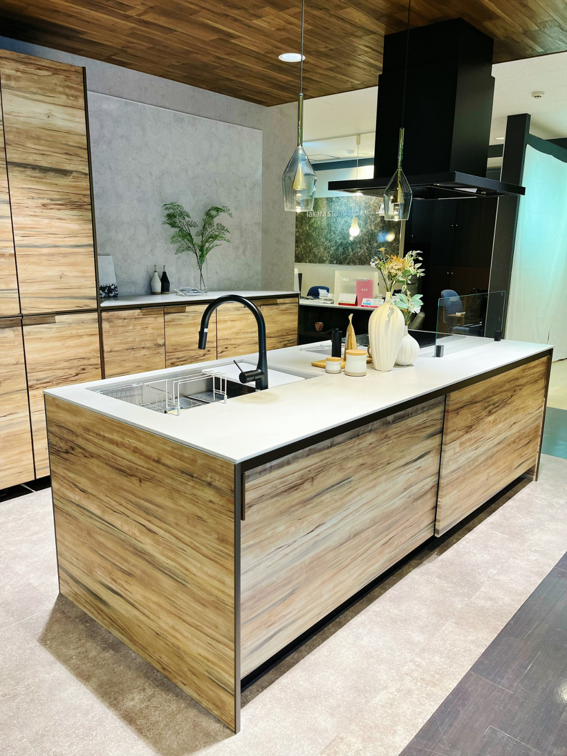 ペニンシュラキッチンやアイランドキッチンなど、様々な種類のキッチンが展示されています。