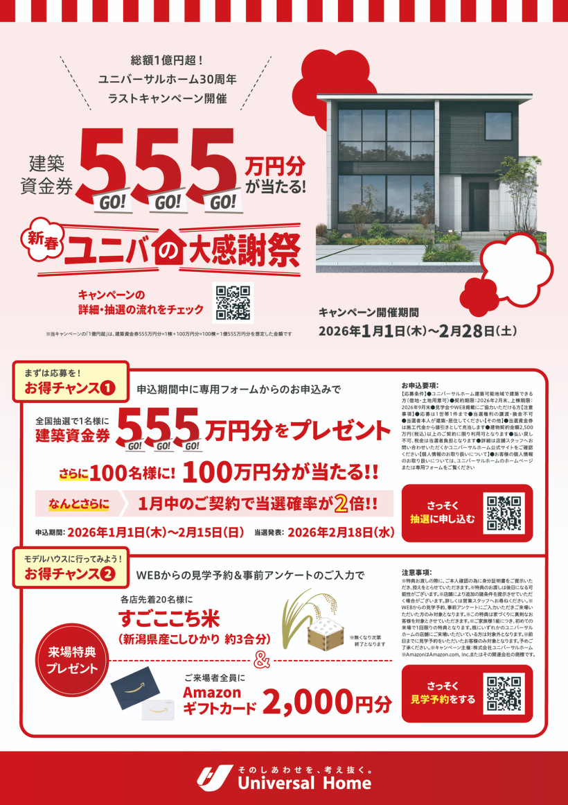 全国抽選で1名様に建築資金券【555万円分】プレゼント!!