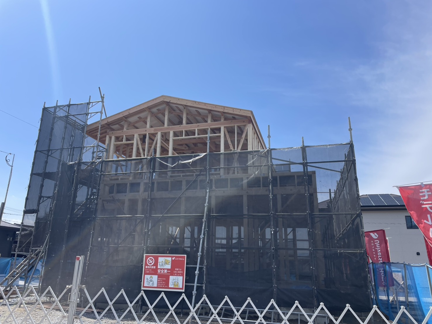 【直方市頓野】棟上げ完了!青空に映える新しいモデルハウス