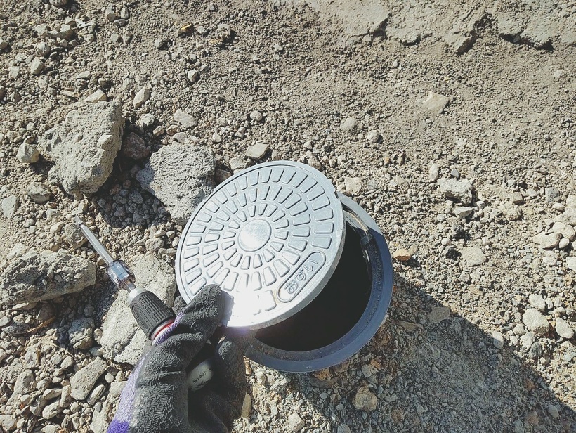 ②次にホースを穴に向けて水圧で汚れを流していきます。