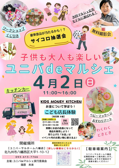 2023年03月27日(月) スタッフブログ < お知らせ ユニバdeマルシェ 皆様こんにちは! 飯塚店の内山です。 今日は週末に開催されるユニバdeマルシェ 沢山の出店者さん達が集まってくれました! 屋外ブース13店舗 屋内ブース11店舗 KIDS MONEY KITCHEN ※実際にお店の店長になって商品を販売体験! 生歌ライブ シンガーソングライターの 肌埜 綾将さんがきてくれます! 沢山のご来場お待ちしております。 八幡店 飯塚店 各サイト 八幡店のインスタグラムはこちら 飯塚店のインスタグラムはこちら ユニバーサルホームのHPはこちら