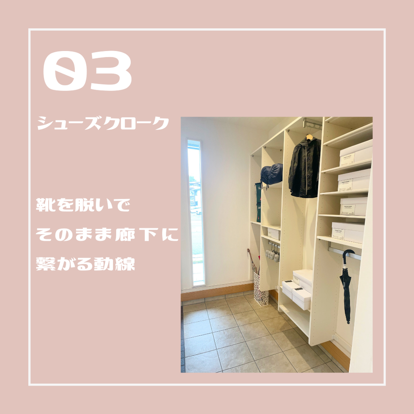 03:靴を脱いで、そのまま廊下に繋がるスムーズな動線です。傘やコートなども掛けれる広々とした収納スペースが特徴。