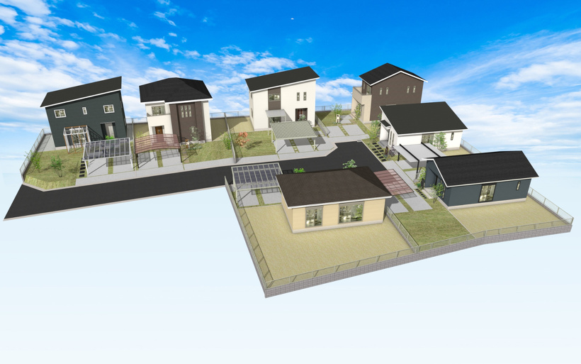 ②7区画ユニバ ーサルホームの家が連なる閑静な新興住宅地