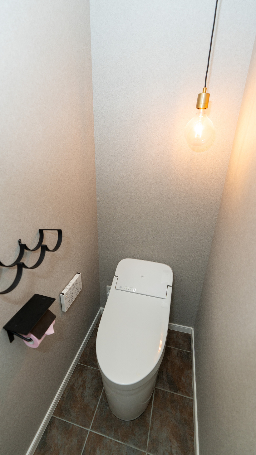 トイレはアイアンのペーパーホルダーと照明で、シンプルかつお洒落に。