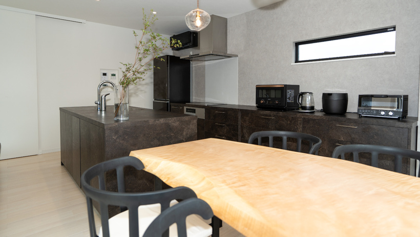 キッチンは今人気のGRAFTEKT KITCHENを採用。家電や小物等も黒に統一することで高級感のあるすっきりとしたお部屋になります。