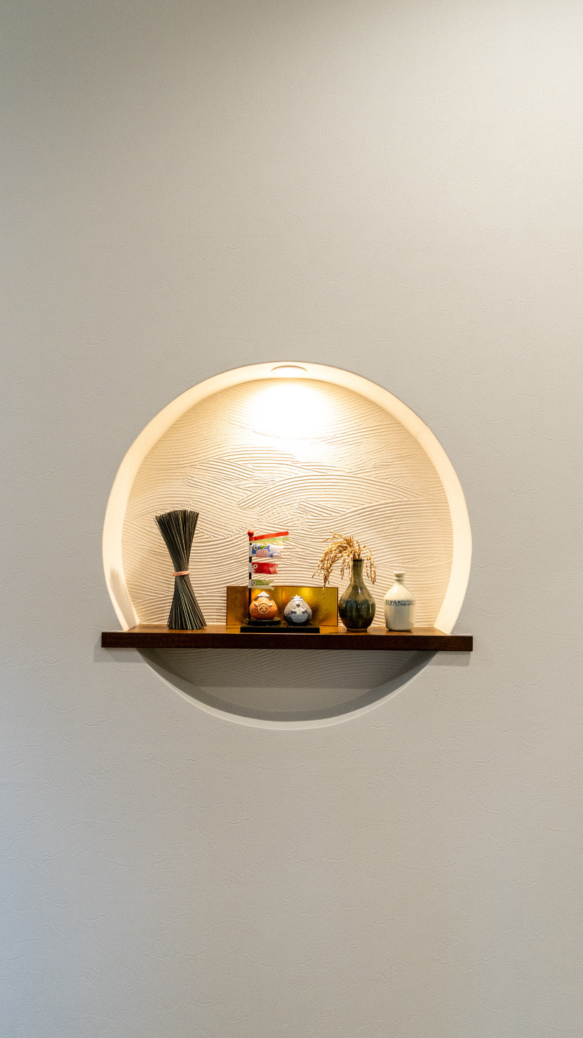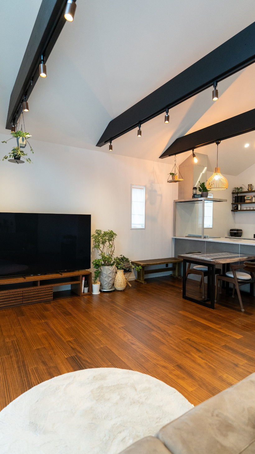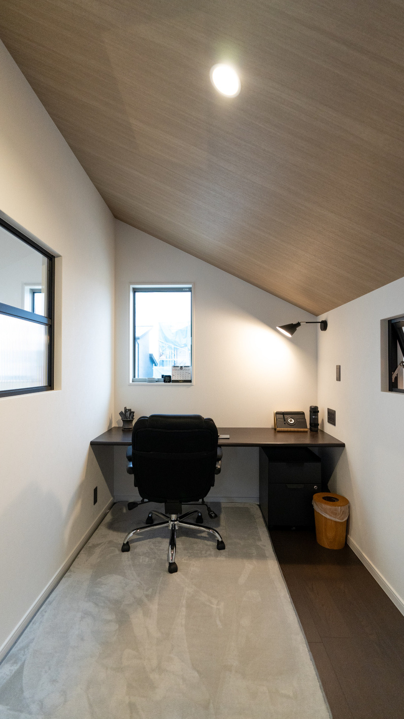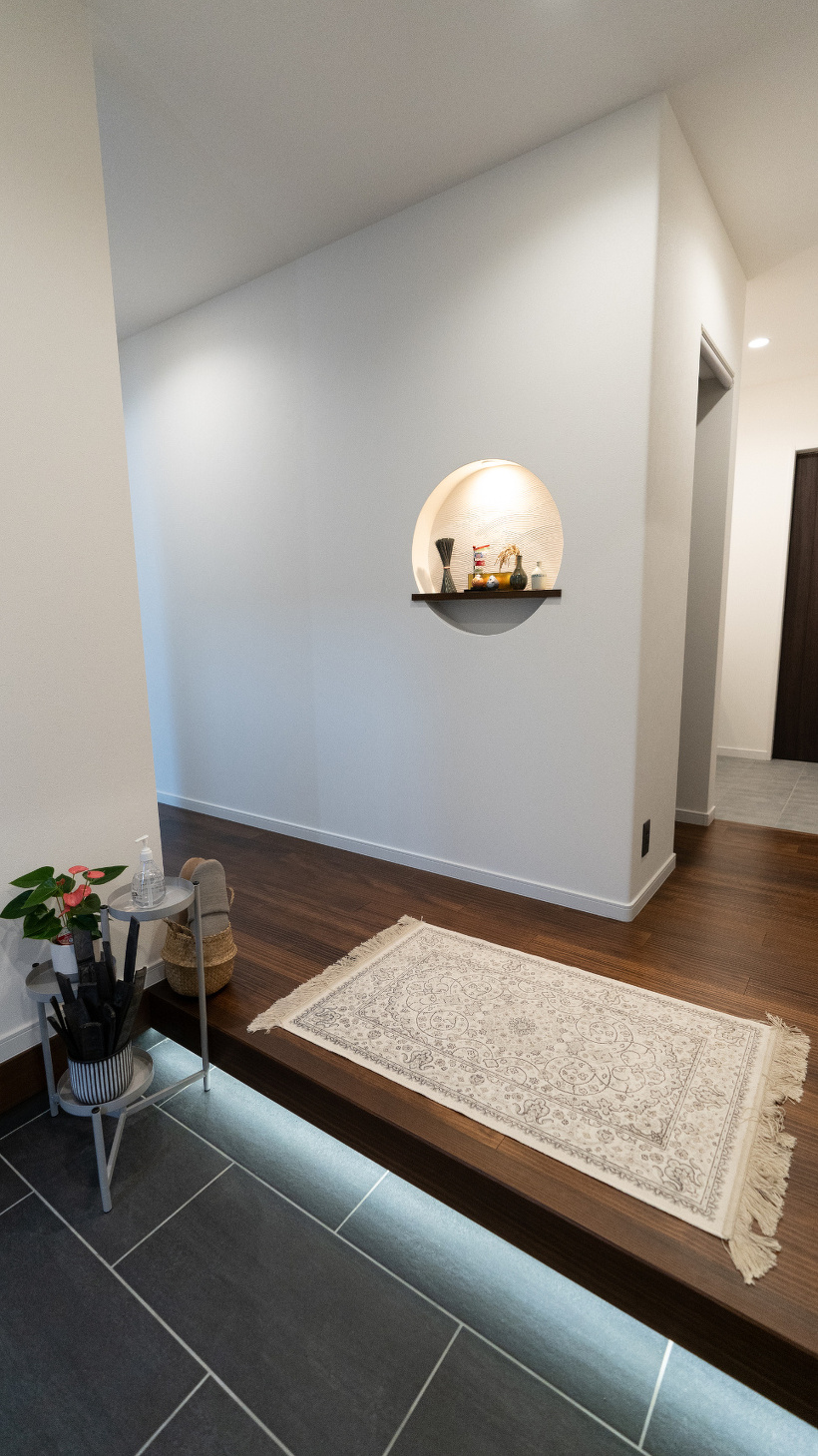 シックで和モダン風のお家 玄関 玄関に入ってすぐの壁には円形のニッチがお出迎え。 照明が点くと浮かんで見える壁紙の模様がさりげないアクセントになっています。 ダイニング LDKの天井を勾配にすることで、梁を活かした開放的な空間が生まれます。 梁に取り付けた照明がデザインのアクセントになっています。 リビング 洗面・脱衣所/トイレ ロフト ロフトはワークスペースとセカンドリビングで、静かに過ごすのに丁度良い空間です。 ご主人様のワークスペースに付いた室内窓もポイントです。 ロフトの室内窓から見えるLDK
