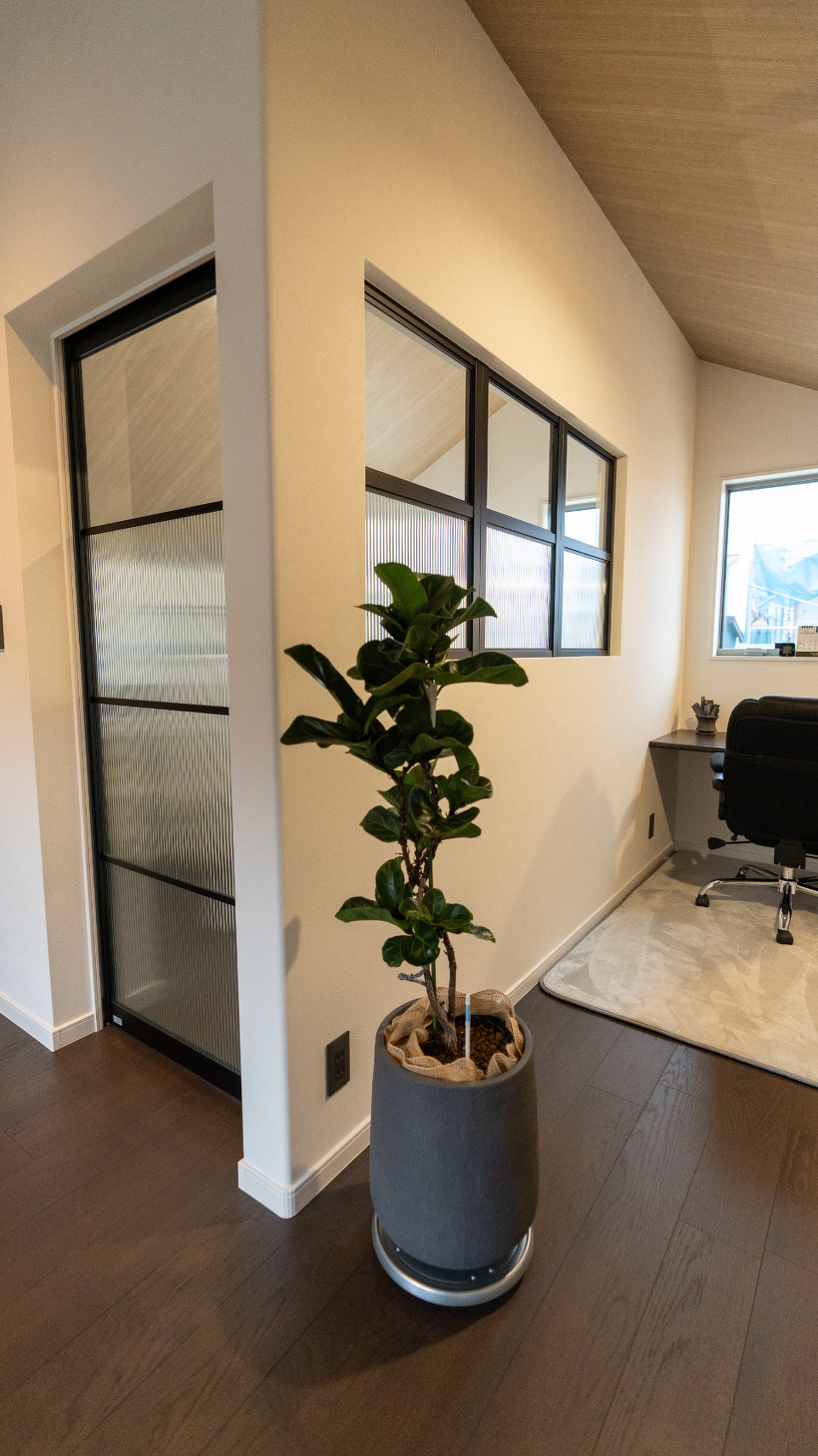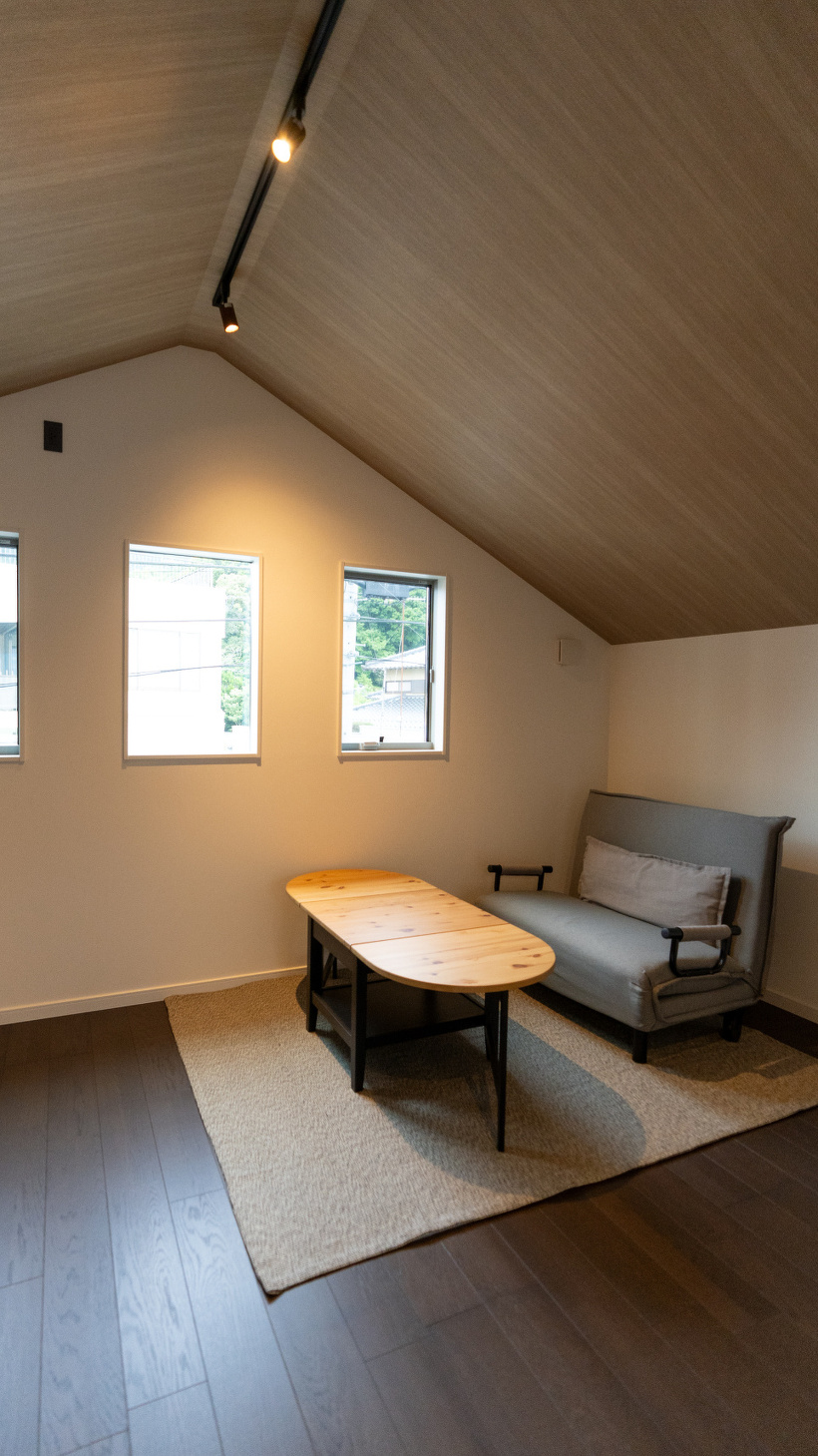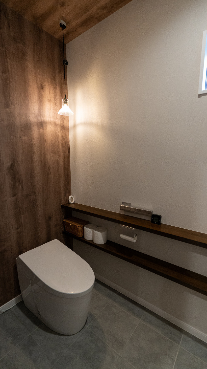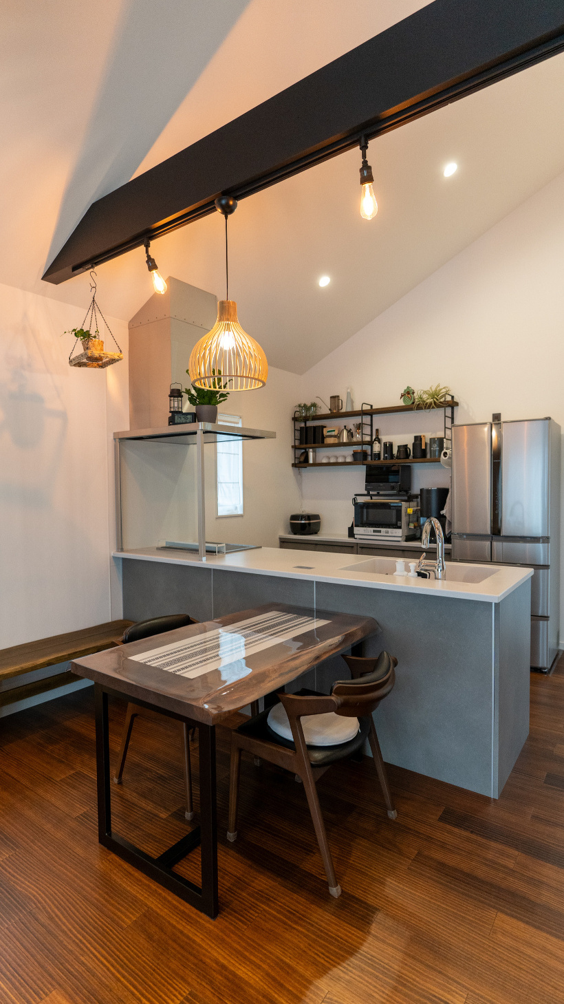 シックで和モダン風のお家 玄関 玄関に入ってすぐの壁には円形のニッチがお出迎え。 照明が点くと浮かんで見える壁紙の模様がさりげないアクセントになっています。 ダイニング LDKの天井を勾配にすることで、梁を活かした開放的な空間が生まれます。 梁に取り付けた照明がデザインのアクセントになっています。 リビング 洗面・脱衣所/トイレ ロフト ロフトはワークスペースとセカンドリビングで、静かに過ごすのに丁度良い空間です。 ご主人様のワークスペースに付いた室内窓もポイントです。 ロフトの室内窓から見えるLDK