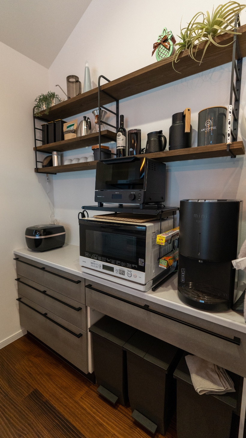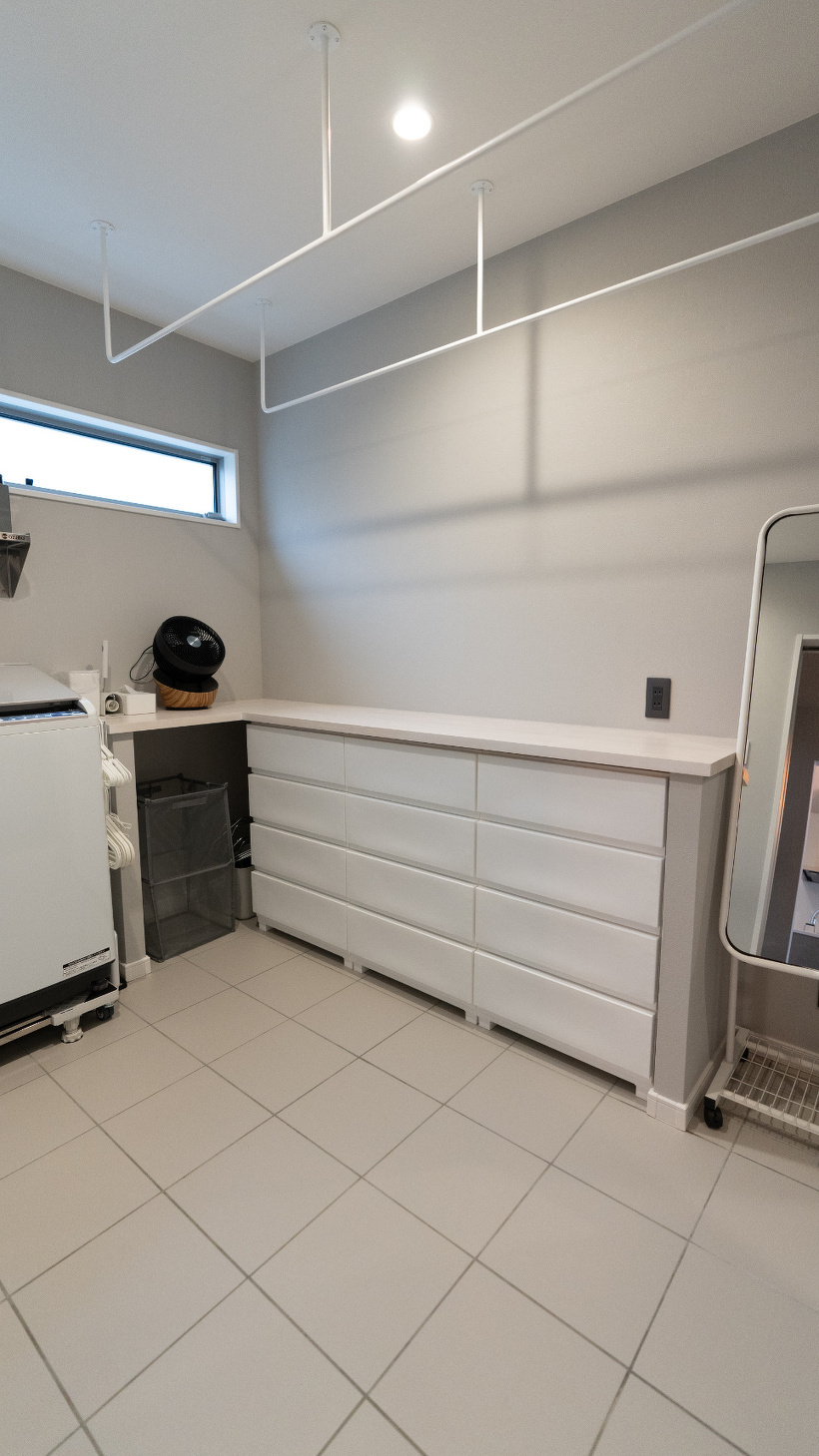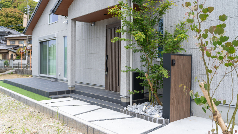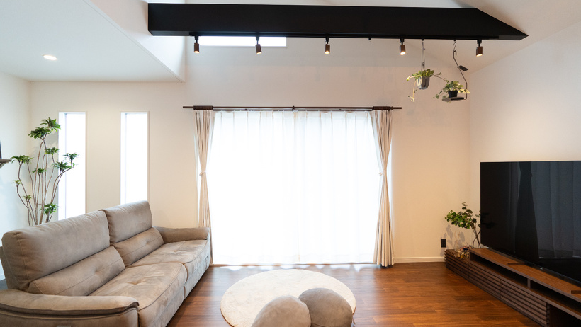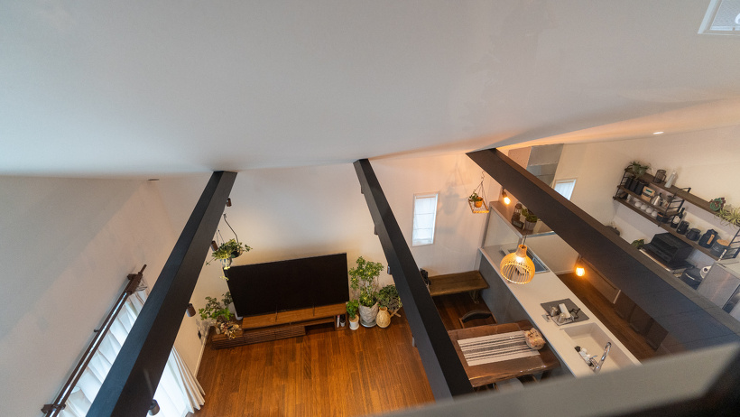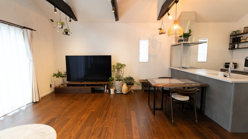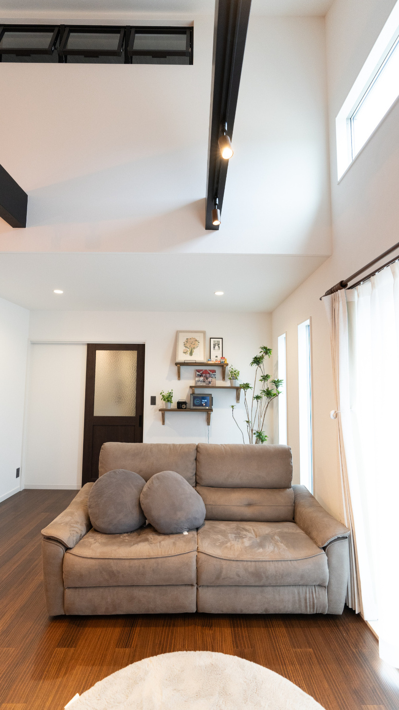 シックで和モダン風のお家 玄関 玄関に入ってすぐの壁には円形のニッチがお出迎え。 照明が点くと浮かんで見える壁紙の模様がさりげないアクセントになっています。 ダイニング LDKの天井を勾配にすることで、梁を活かした開放的な空間が生まれます。 梁に取り付けた照明がデザインのアクセントになっています。 リビング 洗面・脱衣所/トイレ ロフト ロフトはワークスペースとセカンドリビングで、静かに過ごすのに丁度良い空間です。 ご主人様のワークスペースに付いた室内窓もポイントです。 ロフトの室内窓から見えるLDK
