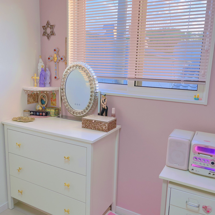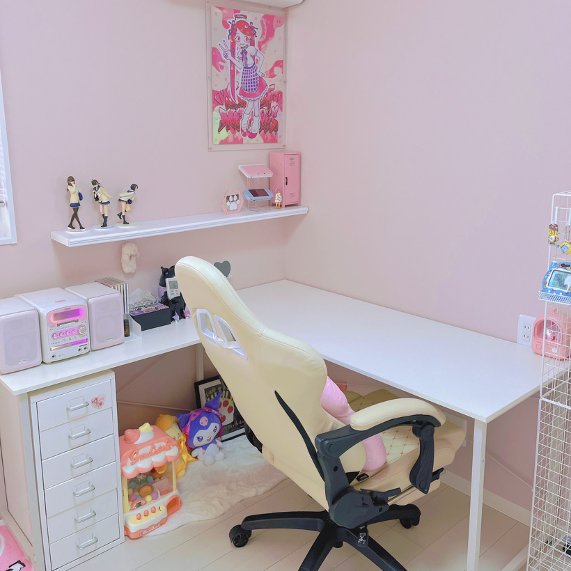 デスク側はピンクの壁紙をベースにすることで雰囲気を変えているのもポイントです。