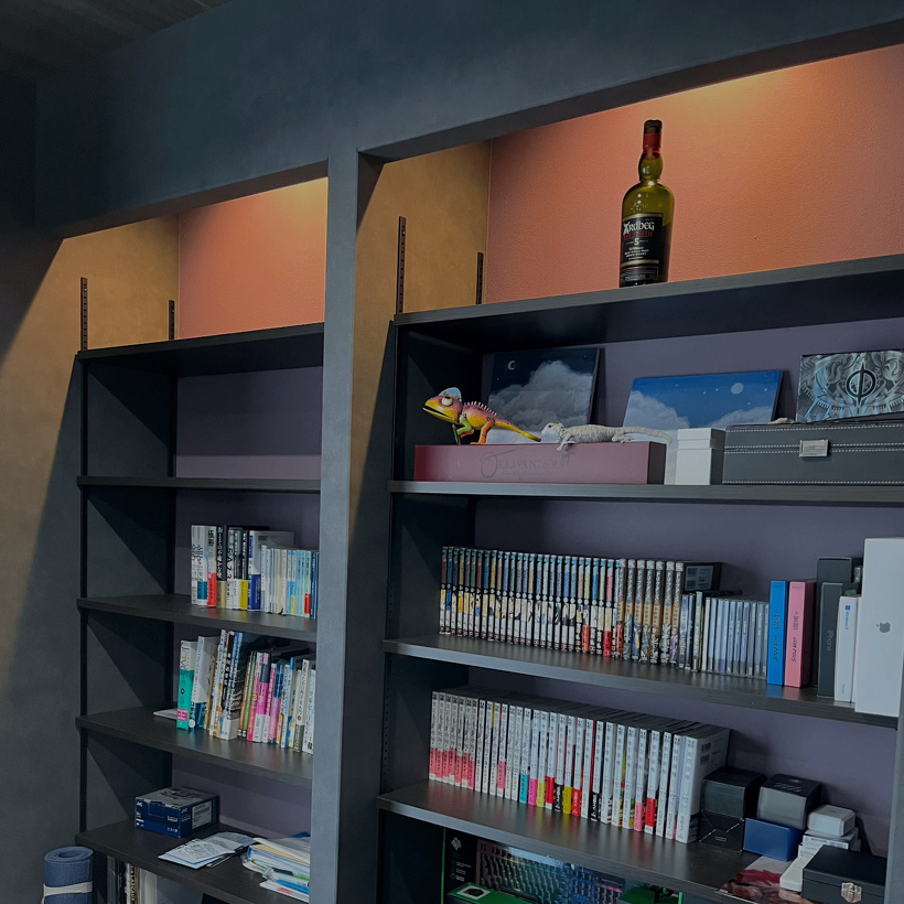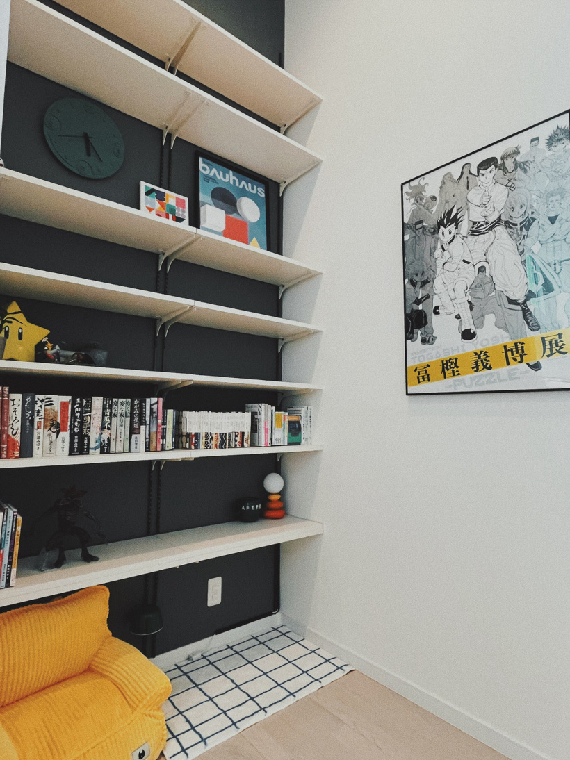 収納棚には漫画本やオブジェを並べ、「見せる収納」としても大活躍。
