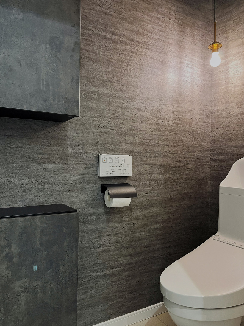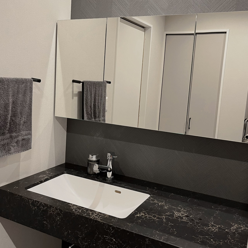 黒系統のタイルや壁紙を使用し、高級感のある空間に。
