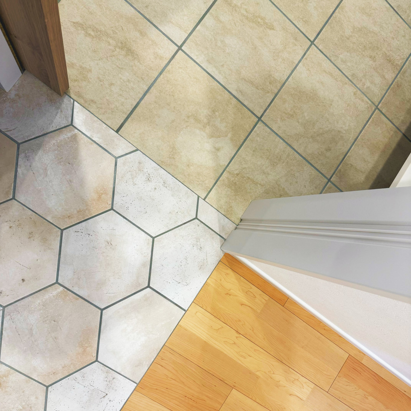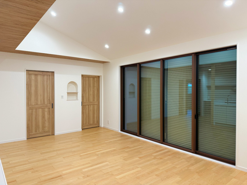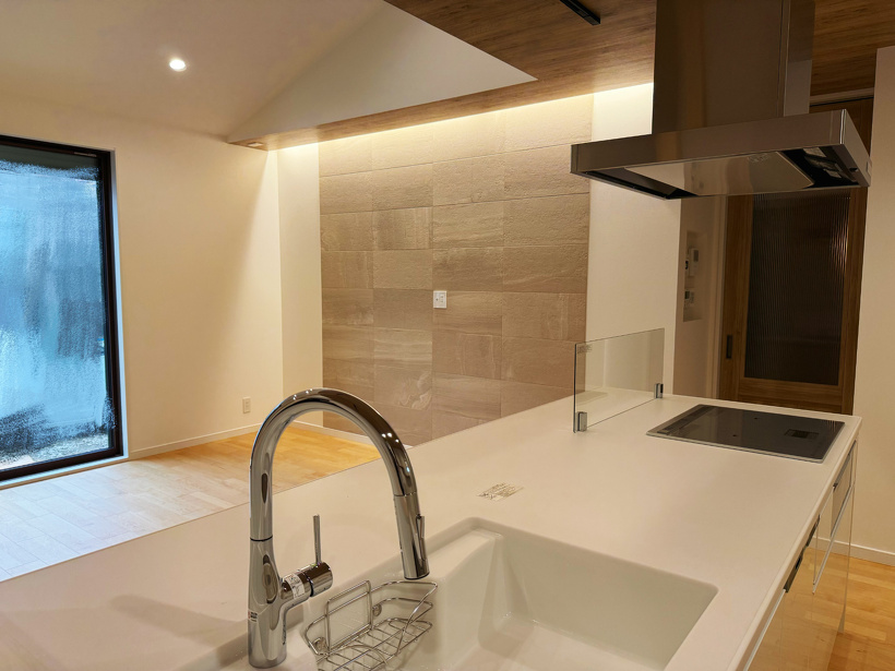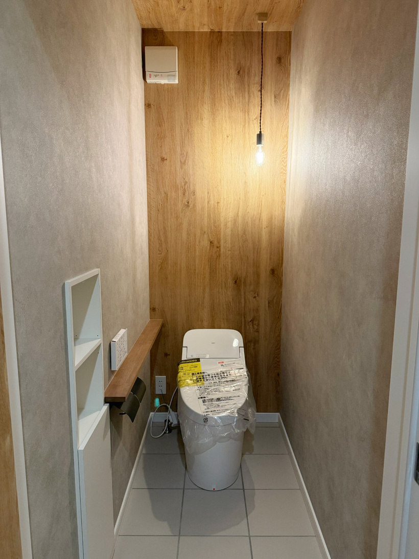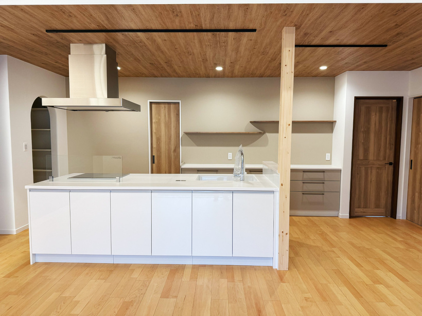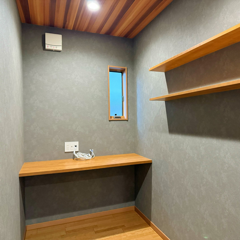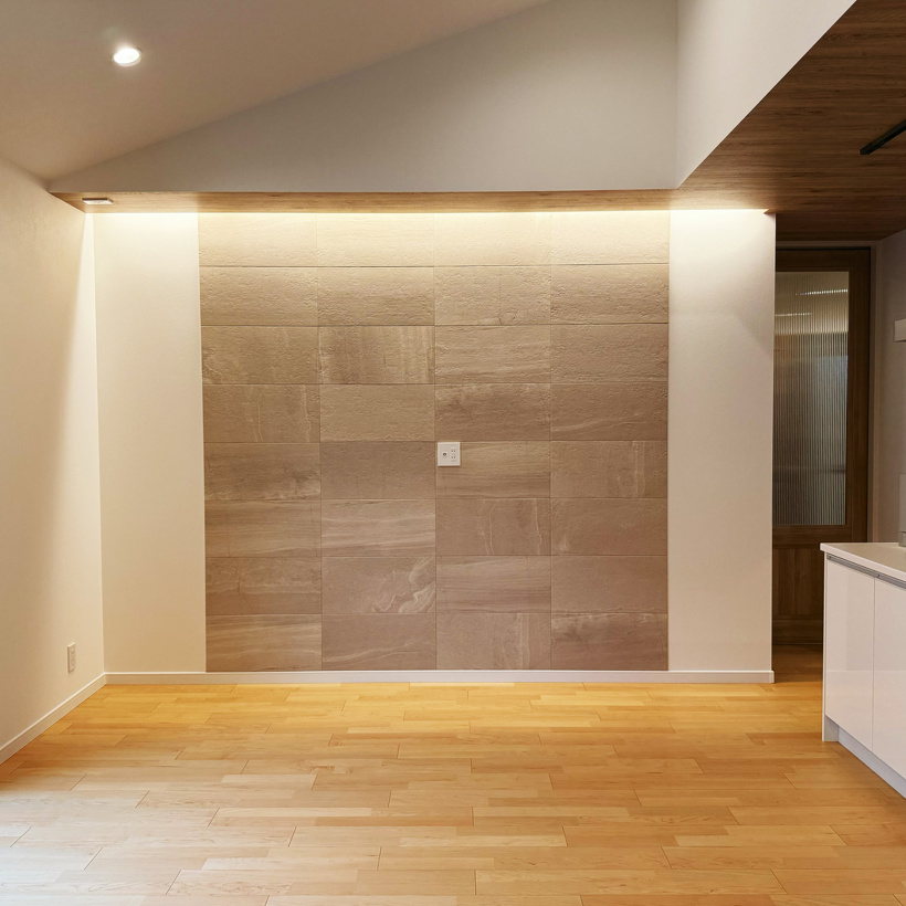 ナチュラルモダンなお家 勾配と木目を組み合わせた天井が特徴です。 テレビを配置する壁面にはエコカラットのタイルを貼り、高級感溢れる雰囲気となっております。 L.D.K 書斎やワークスペースとして活用できるお部屋 キッチンの収納スペース ディスプレイとして活用できるニッチ 洗面所 ハニカム柄のタイルでお洒落で個性のある空間を彩ります。 場所によってタイルのデザインを切り替えることも可能です。 寝室 間接照明を取り入れてホテルライクなお部屋に。見せる収納としても活用できます。 トイレ 木目とグレーの組み合わせで落ち着いた雰囲気に。ペンダントライトでアクセントを。