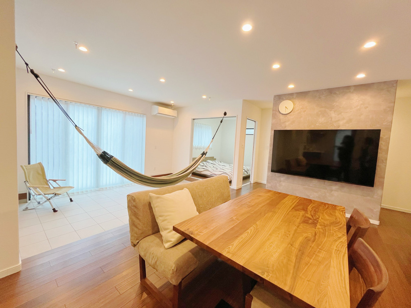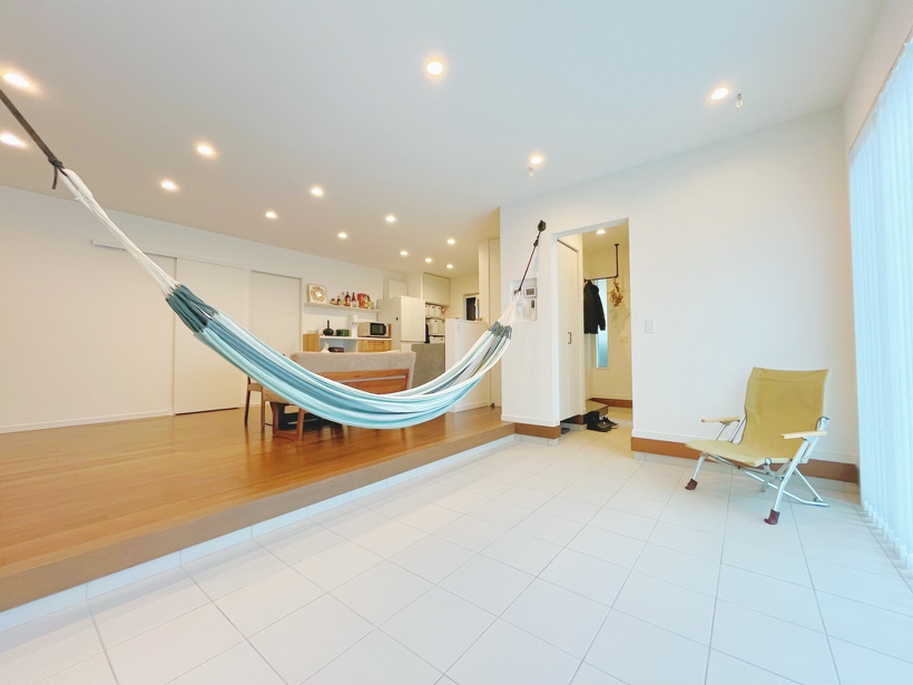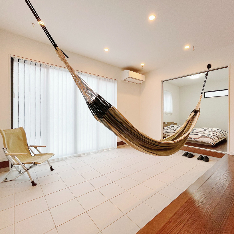 土間フロアは、趣味のキャンプに利用したり、ハンモックでくつろいだりできるスペースとして活用されています。