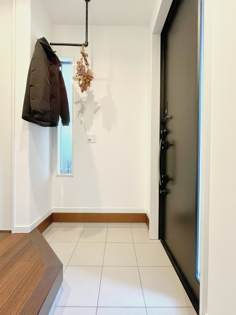LDKの土間スペースと直接繋がる玄関。アイアンのコート掛けのおかげで、外出時も便利になります。