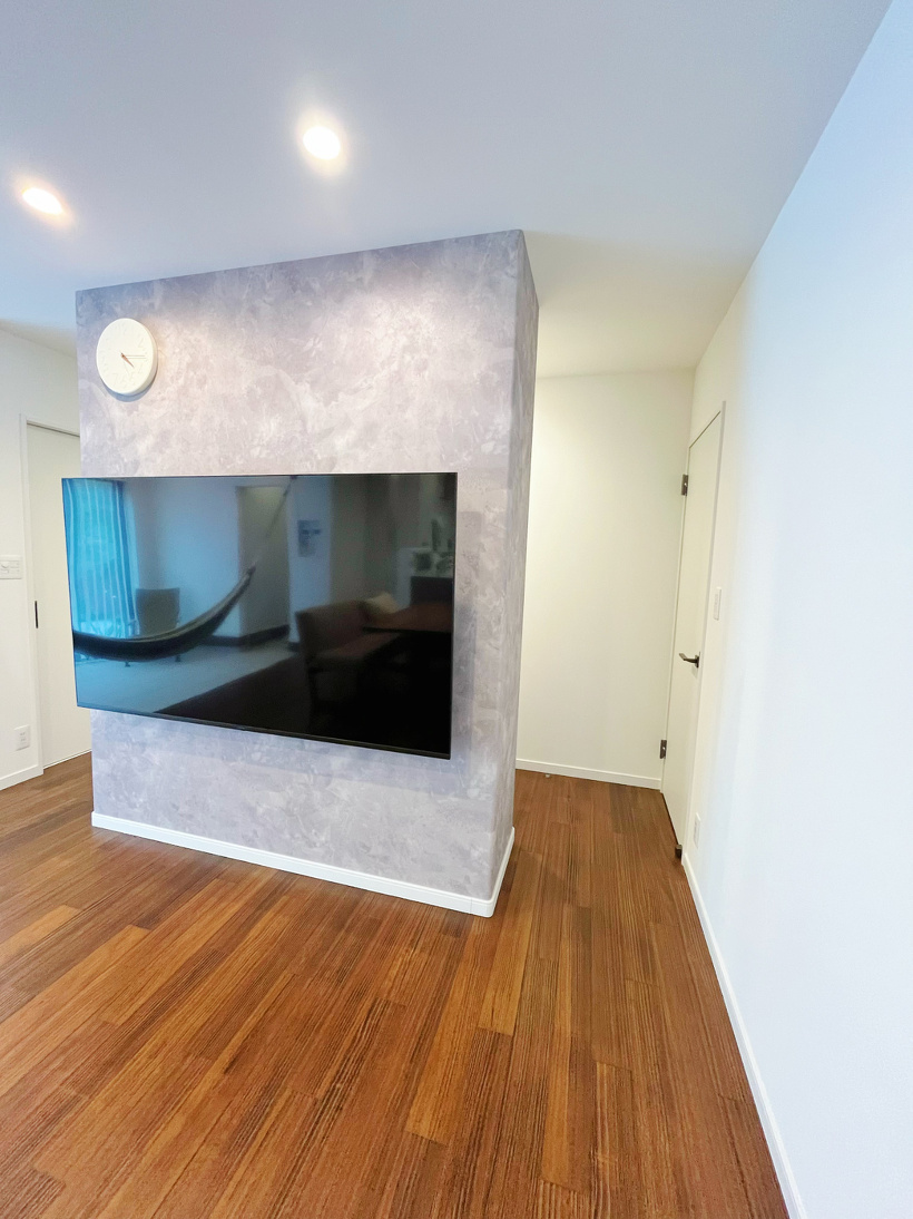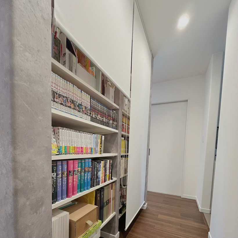 テレビボードの裏は本棚となっており、通路スペースの他にも活用できる動線に。