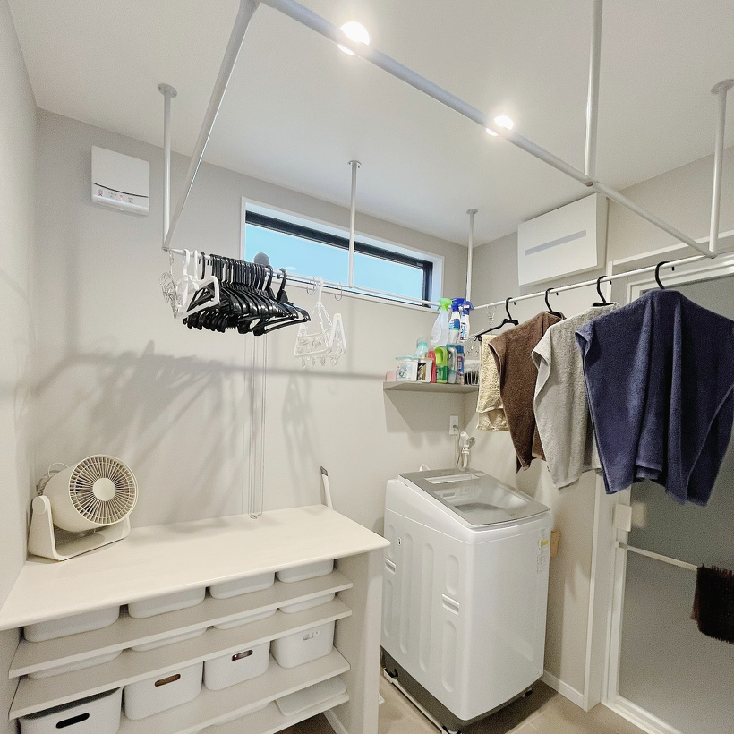 白いスチールの物干しで、スペースを気にせず洗濯物を干すことができます。