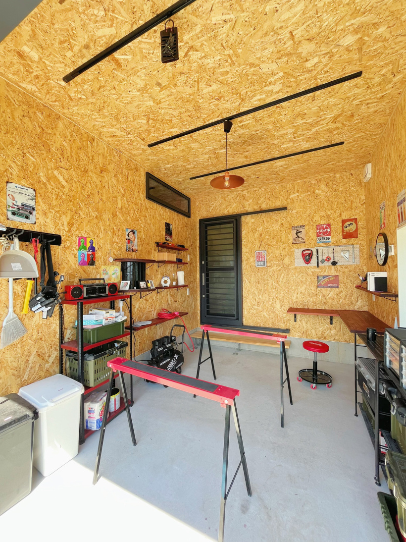 ご主人様の趣味やこだわりの詰まったガレージスペース。工具をしまう収納など好きなカスタマイズも楽しめます。