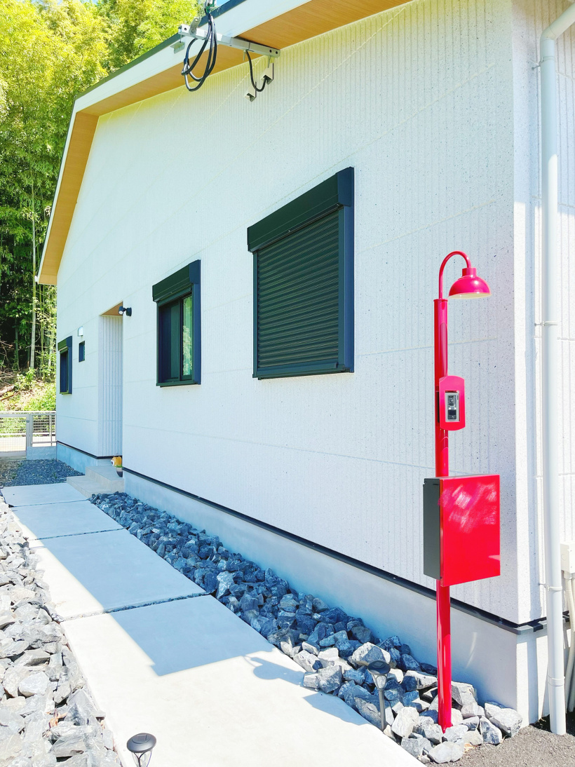 赤いポスト付インターホンがアクセントカラーになっているのがポイント。