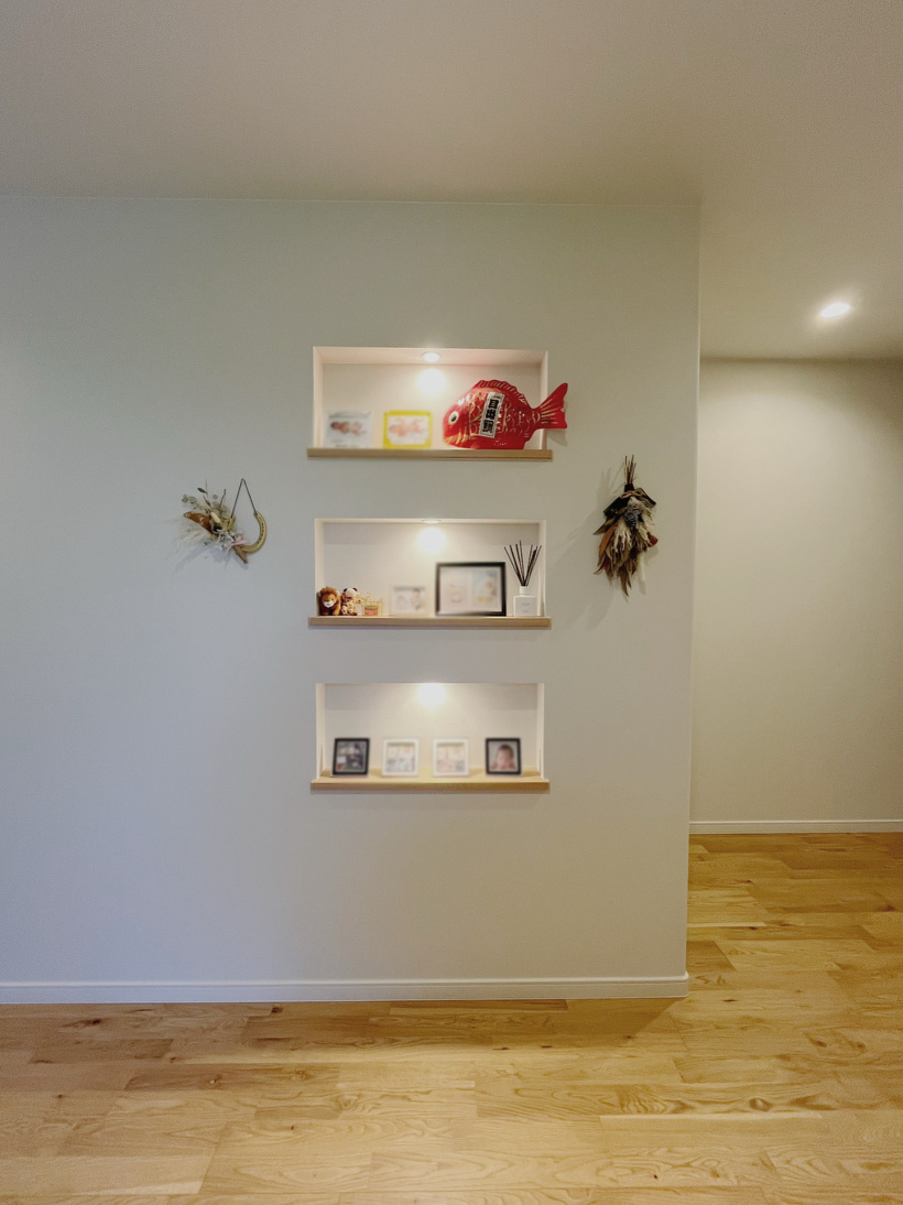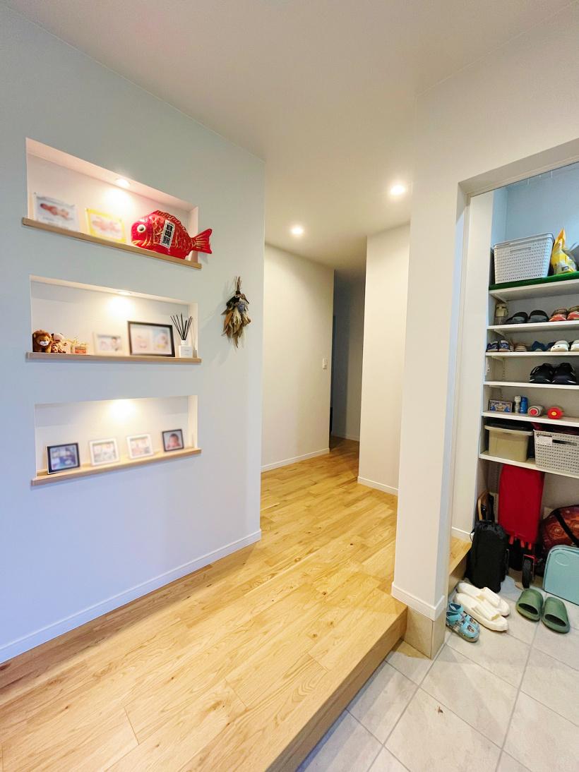 玄関に入ると写真や小物が飾れる専用のニッチがお出迎え。