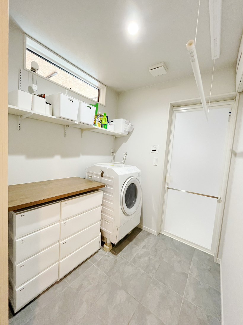 アイロンがけや洗濯物がたためる作業用カウンターを設けていますが、収納スペースに困らないデザインとなっています。