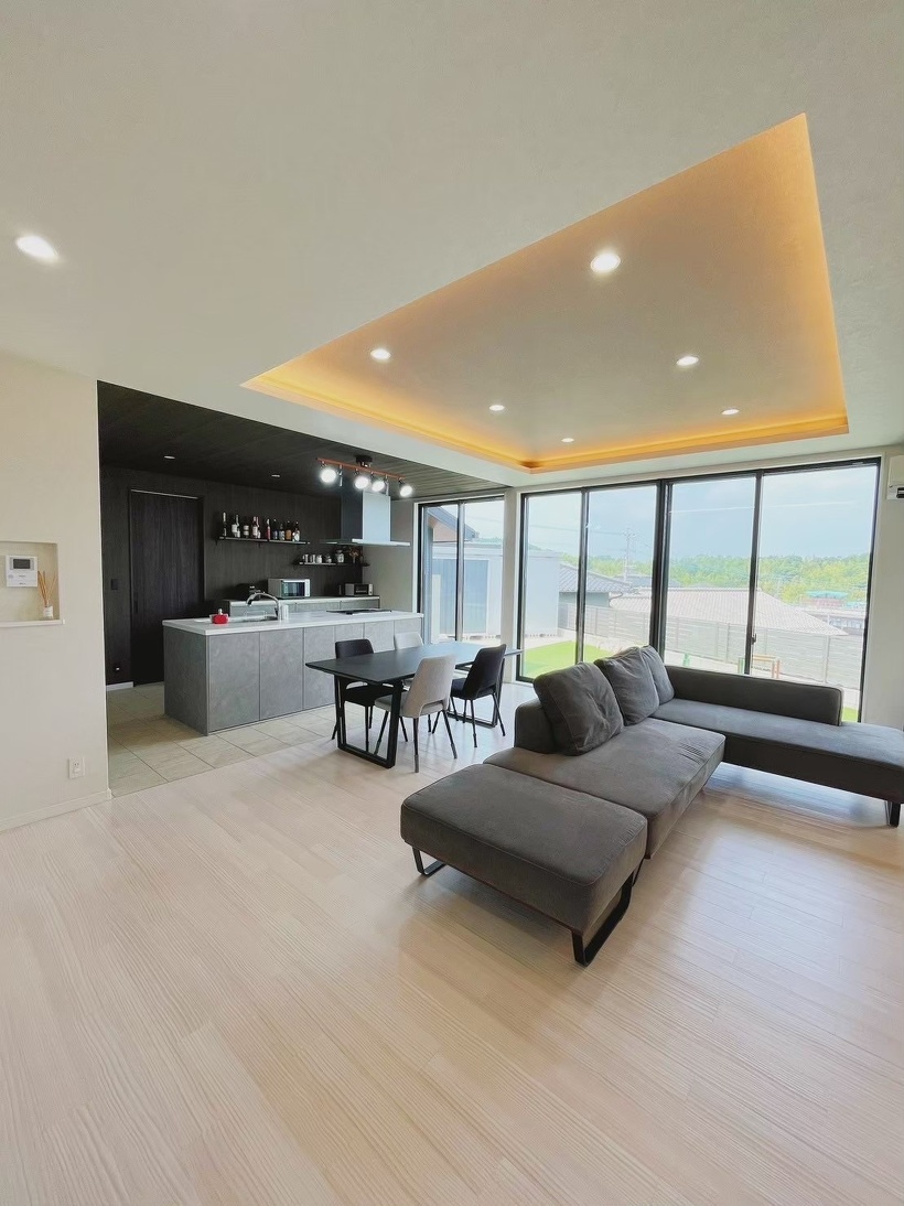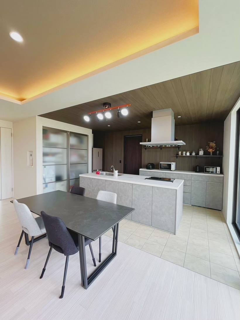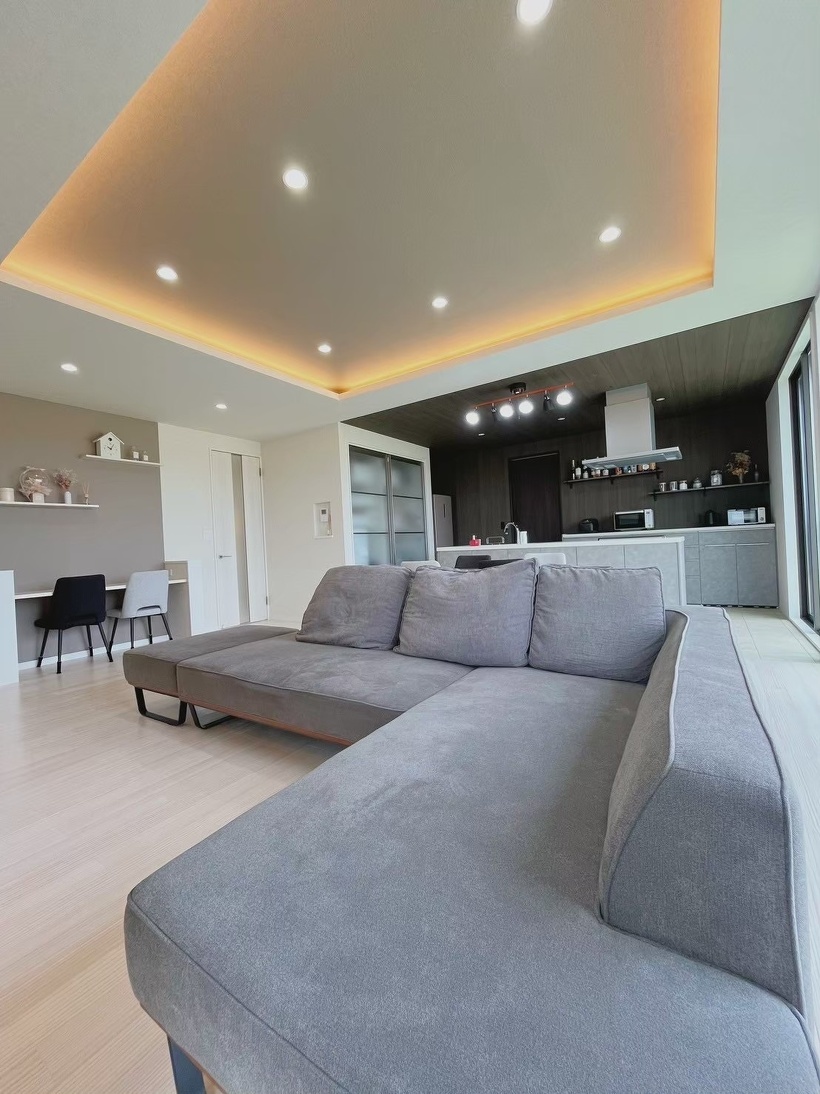 また、リビング天井は部分的に高さを上げ、間接照明で柔らかく洗練された空間を演出しています。キッチンからリビングまでまっすぐ繋がっている動線のため、食事からリラックスタイムまで家族で集い、過ごすことができます。