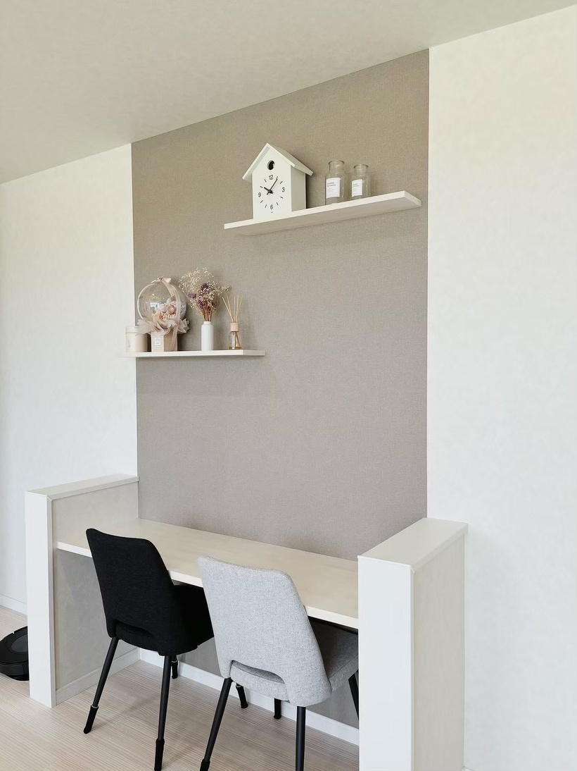 グレーのアクセントクロスに小物が並べられる可愛いカウンターの組み合わせもポイントです。