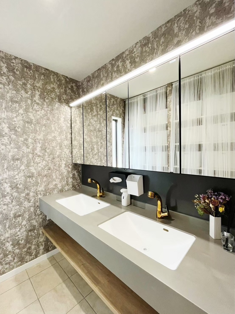 落ち着いたトーンの壁紙と照明が調和し、毎日の身支度も心地よいひとときに。