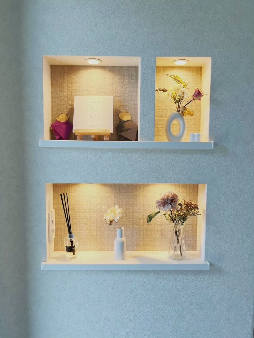 ニッチにはそれぞれ照明が優しく照らされており、飾るアイテムをより魅力的に引き立たせます。
