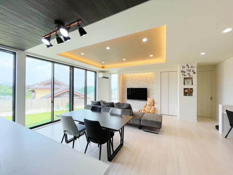 全面ガラスによって自然光を広く取り入れたLDKが特徴のお家。