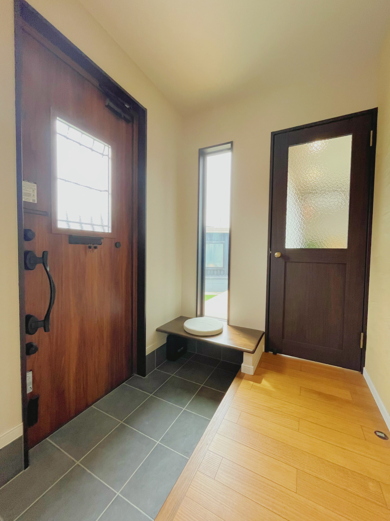 玄関に入ってすぐに腰を下ろせるベンチカウンターが設置されています。スッキリとした縦長の窓は、デザイン性も兼ねつつ光を取り入れて玄関を明るい雰囲気にする効果もあります。