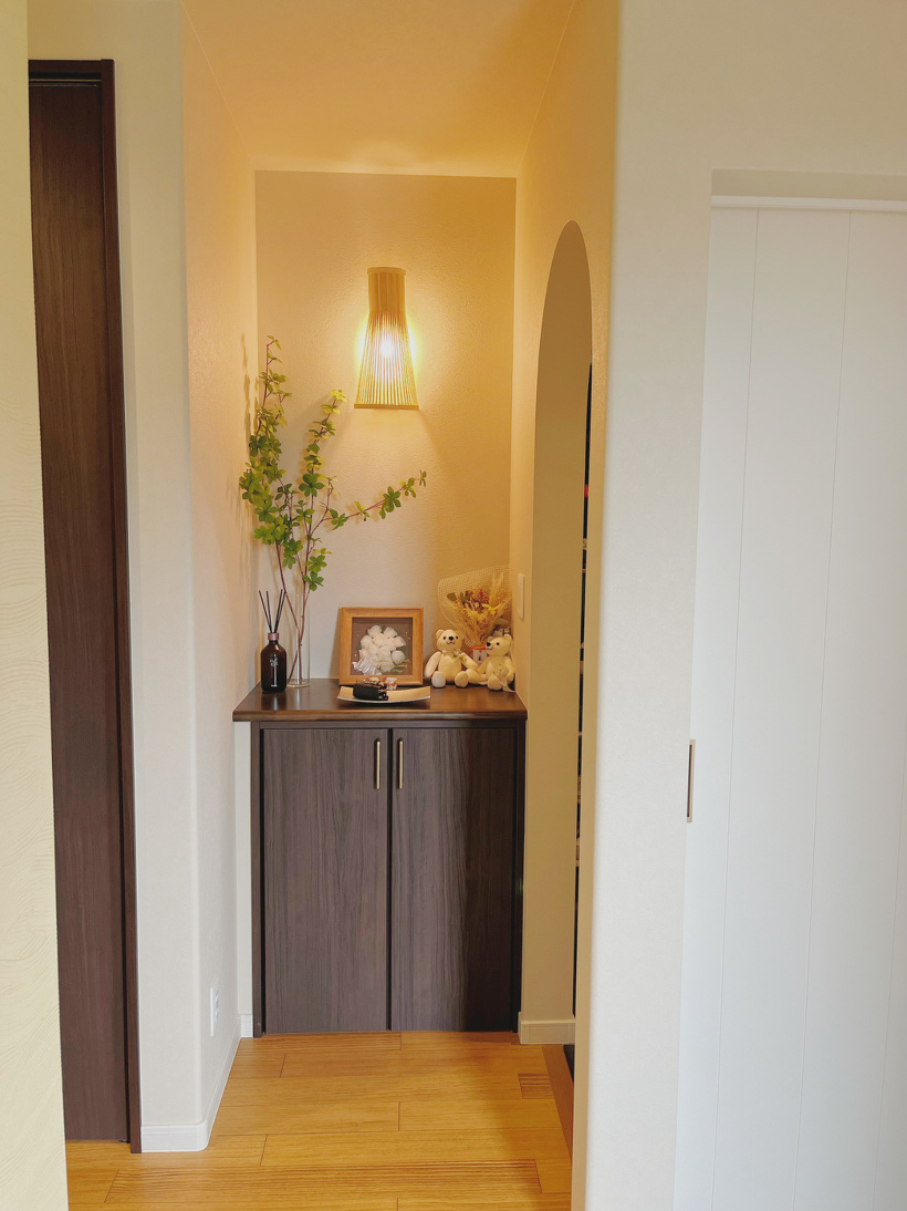 また、廊下へと繋がる動線は無駄がなくスマートな設計になっており、ブラケットライトで照らされたディスプレイスペースによって、毎日の帰宅も楽しくなります。