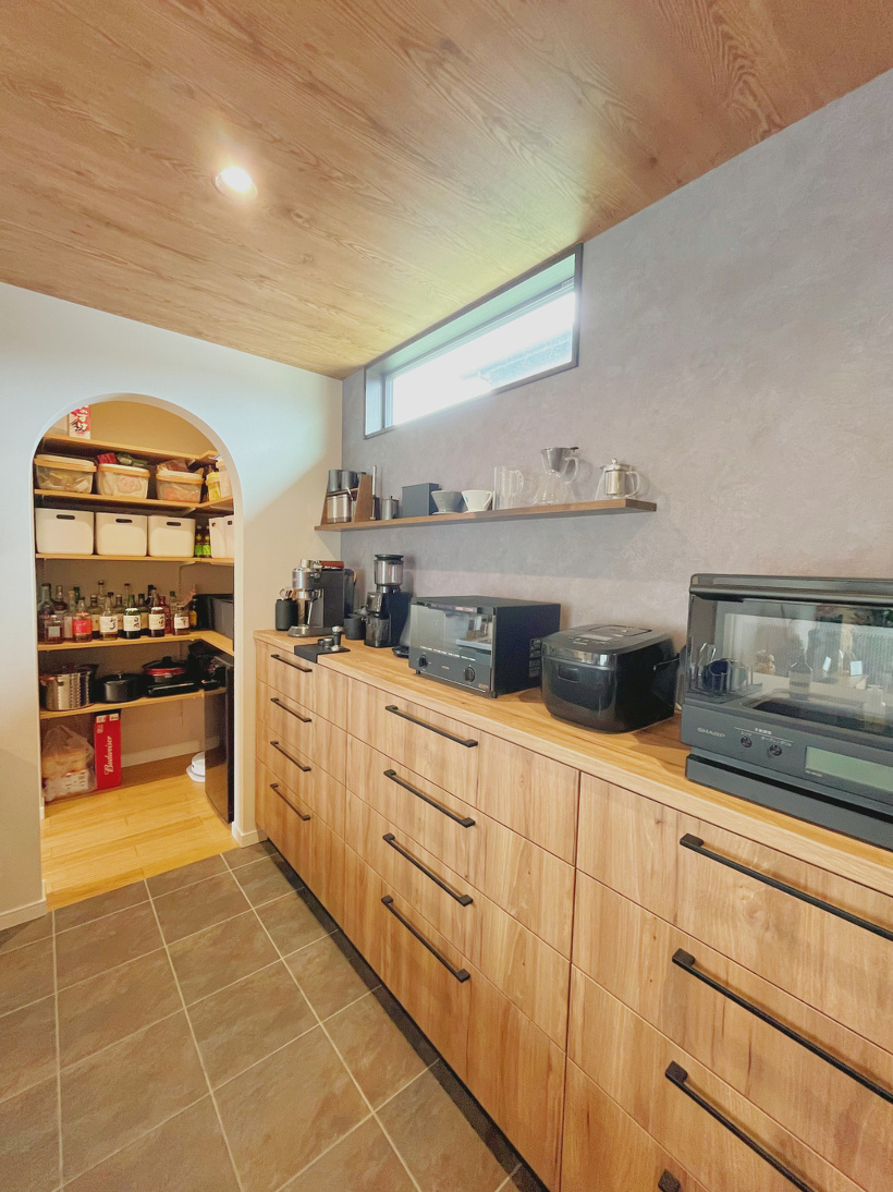 奥のパントリーには好みのお酒を並べて、見せる収納としても活用できます。