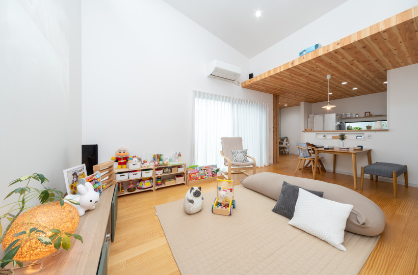 勾配天井のあるリビングは解放感と優しい光が差し込む温かな空間に。