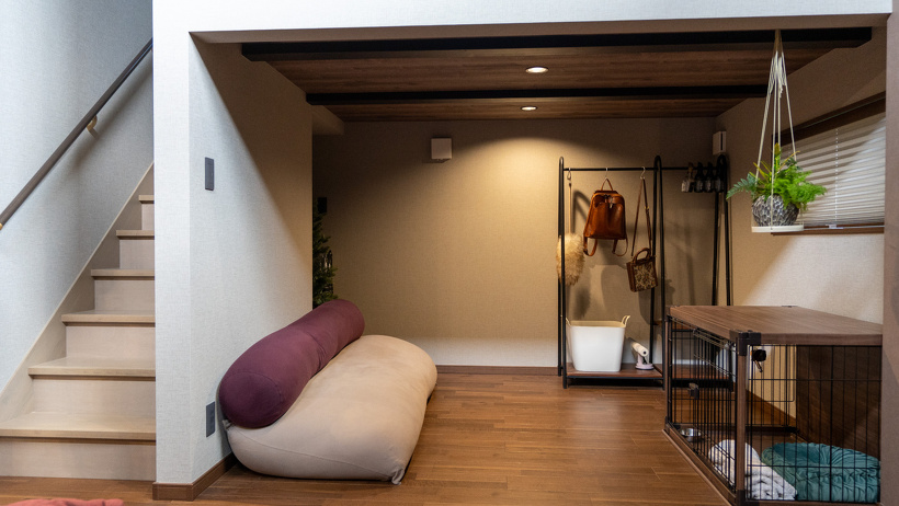 下はワンちゃんのお部屋とくつろげるフリースペースです。収納場所としても利用できるため便利ですね。